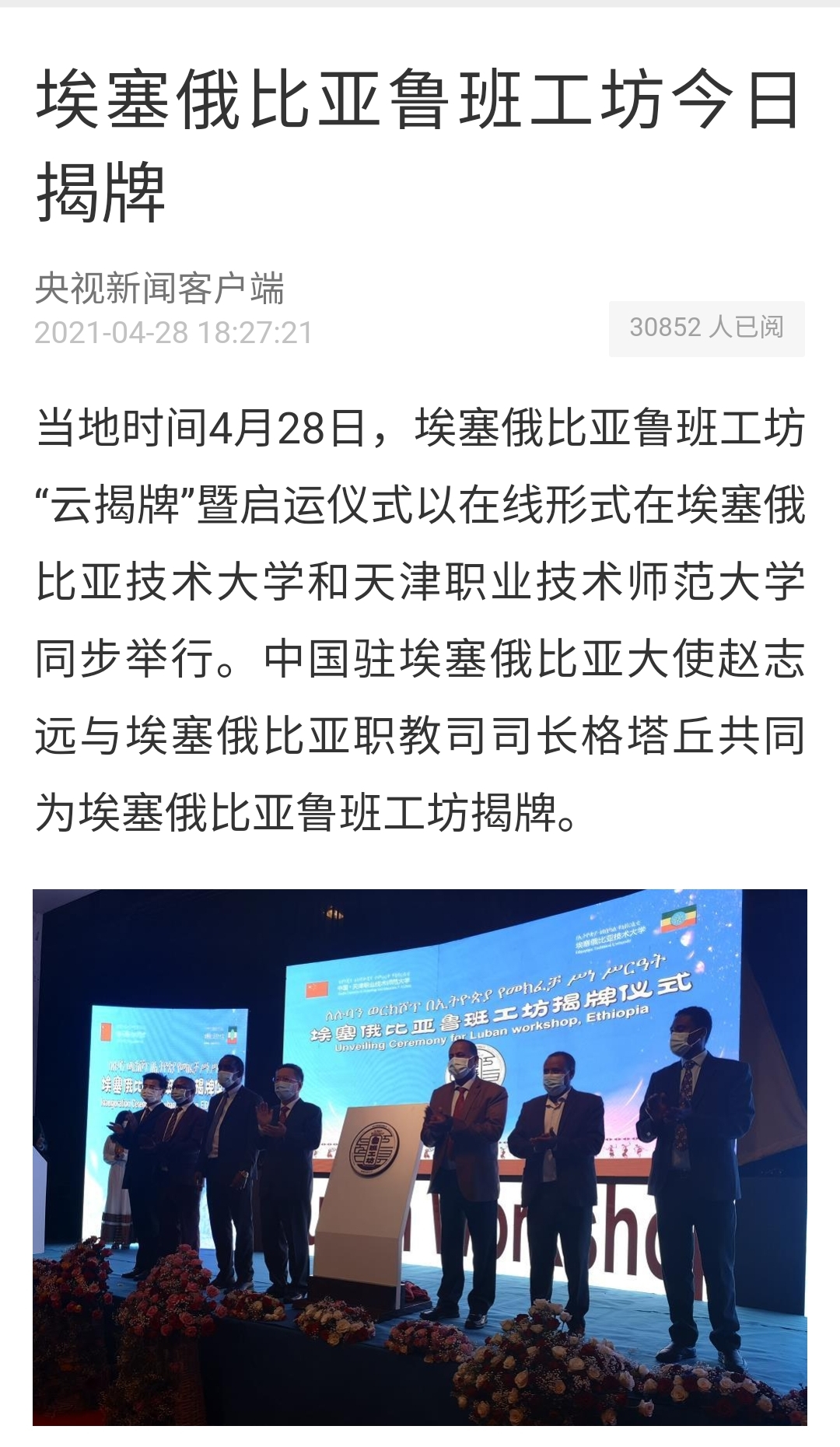 今日央瞅消息客户端以“埃塞俄比亚鲁班工坊本日掀牌 ”为题,报导rb88体育取埃塞俄比亚技能年夜教同修的埃塞俄比亚鲁班工坊举办“云掀牌”开动经营典礼。